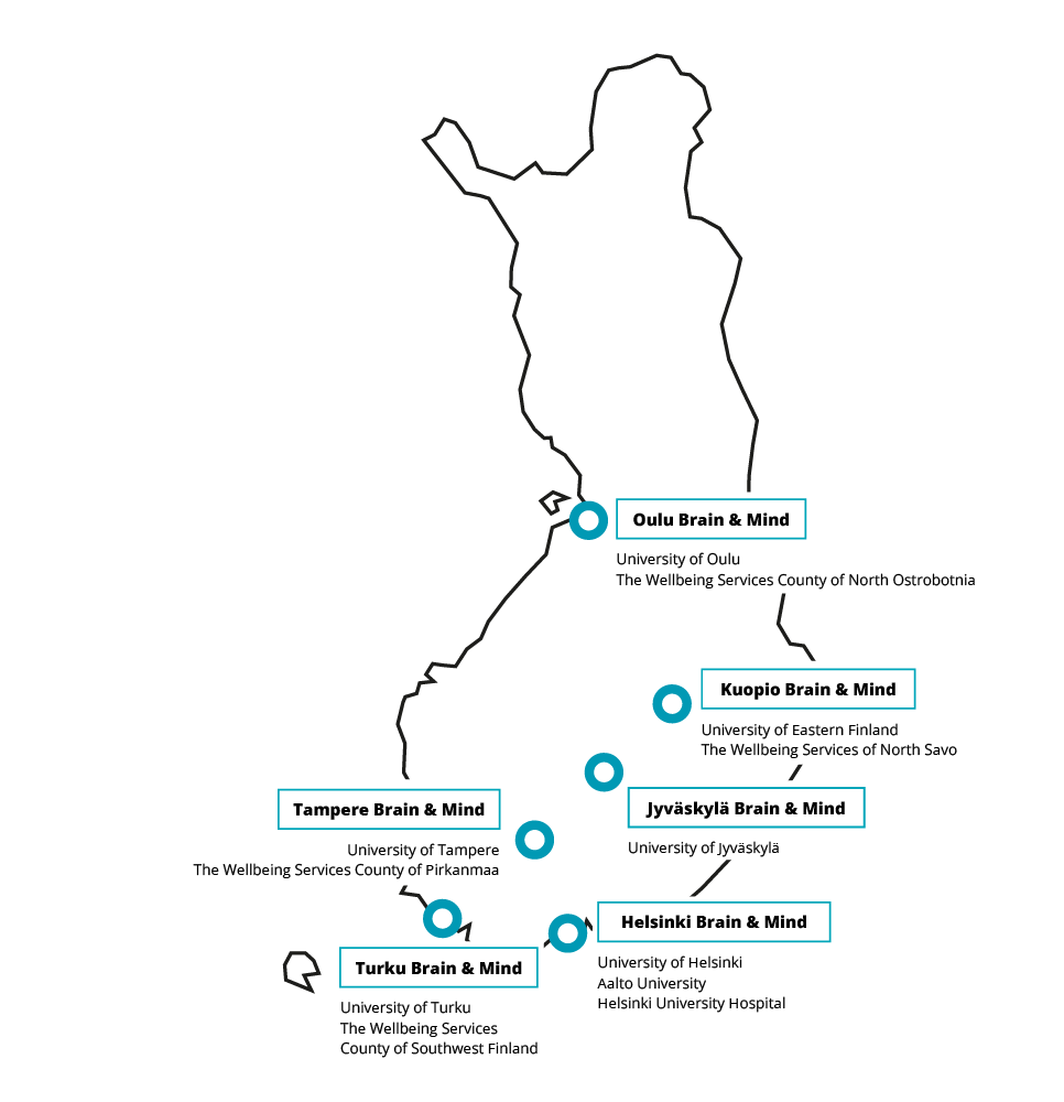 Jäsenorganisaatioitamme ovat 7 yliopistoa ja 5 hyvinvointialuetta, joihin kuuluvat yliopistolliset sairaalat. Näistä muodostuu kuusi alueellista Brain & Mind -verkostoa Oulussa, Kuopiossa, Jyväskylässä, Tampereella, Turussa ja Helsingissä. Kuopiossa sijaitseva koordinaatioyksikkö toimii kansallisen ja kansainvälisen toiminnan keskipisteenä ja se koordinoi alueellisten Brain & Mind -verkostojen toimintaa ja yhteistyötä.